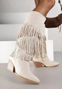 Beżowe Kozaki Kowbojki na Stożku Ozdobione Frędzlami Giolanda
