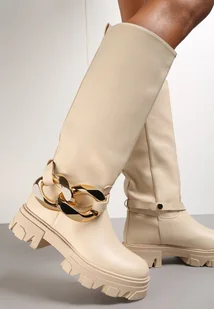 Kozaki Mesis wsuwane, wykonane z gładkiej, ekologicznej skóry. Z wysoką cholewką przed kolano i okrągłym noskiem. Na dole, wokół cholewki zapinany na zatrzask pasek z grubym łańcuchem. Osadzone na płaskiej, grubej podeszwie ze żłobieniami. Z zaokrąglonym noskiem.