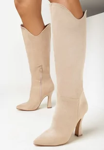 Beżowe Kozaki na Obcasie i Platformie z Dopasowaną Cholewką Astala