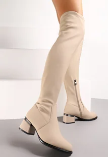 Beżowe Kozaki na Słupku ze Elastyczną Cholewką Ellitra