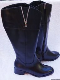 Kozaki ze skóry z szeroką cholewką 50 cm w rozmiarach 39 - 41 Butynawymiar przedstawiają Państwu czarne kozaki z naturalnej skóry wysokiej jakości ocieplone polarem . Przykuwające oczy obuwie na obcasie płaskim 4 cm, z podeszwą 1, 2 cm o strukturze typu traper. Podeszwa z ociepleniem , antypoślizgowa, na co warto zwrócić uwagę jesienią i zimą. Przy kostce znajduje się mała ozdoba. Dodajmy , że z boku wszyty jest krótki (11 cm) zamek oraz gumki, rozciągające cholewkę w 3/4 i na końcu cholewki nawet o dodatkowe 3 centymetry.