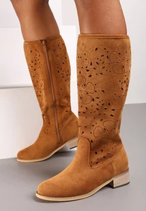 Brązowe Ażurowe Płaskie Kozaki w Stylu Boho Zapinane na Suwak Velmara