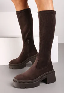 Brązowe Dopasowane Kozaki na Grubej Podeszwie ze Skarpetkową Cholewką Hanilinn