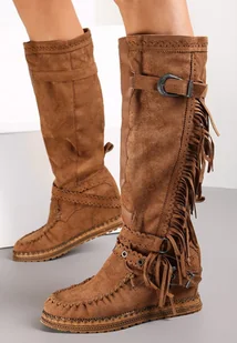 Kozaki Aksinya wykonane z ekozamszu. To typowe kowbojki osadzone na ukrytym koturnie i podeszwie ze żłobieniami. Z tyłu cholewki ozdobione frędzlami, a z przodu wstawką z ekoskóry. Wokół kostki i przed kolanem paski ze sprzączkami. Modne kozaki Aksinya są nieocieplalne.
