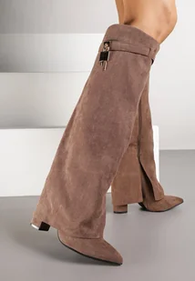 Kozaki na Słupku Ozdobione Metaliczną Kłódką i Wywiniętą Cholewką Lattorea to must-have dla każdej modnej kobiety! Ich elegancki słupek świetnie podkreśla sylwetkę, a wywinięta cholewka dodaje charakteru stylizacji. Idealne zarówno na co dzień, jak i na wieczorne wyjścia zestaw je ze spodniami i oversizeowym swetrem na lunch z przyjaciółkami lub z dopasowaną sukienką na ważne spotkanie. Dodatkowo metaliczna kłódka to subtelna ozdoba, która przyciągnie spojrzenia i podkreśli Twój unikalny styl! Zapinane na suwak.