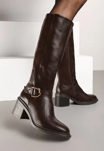 Brązowe Kozaki na Słupku z Ozdobną Klamrą i Paskiem Miavirae