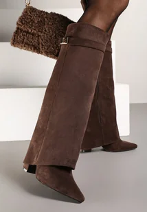 Brązowe Kozaki na Słupku z Wywiniętą Cholewką i Klamerką Upaxa