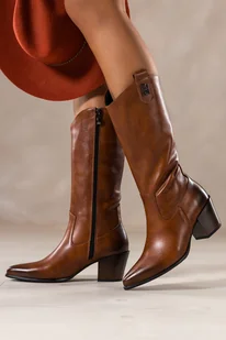 Brązowe kozaki skórzane damskie kowbojki na szerokim ściętym klocku stalowa ozdoba PRODUKT POLSKI Casu 29844