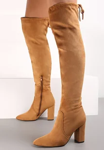 Kozaki Teth na słupku, w całości wykonane z ekozamszu. Elegancki, szpiczasty nosek, z delikatnymi przeszyciami na wysokości śródstopia. Dopasowana cholewka sięgająca za kolano oraz zakończona regulowanym ściągaczem ze sznurkiem. Zasuane na zamek błyskawiczny po wewnętrznej stronie. Lekko ocieplane kocem obuwniczym.
