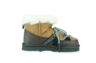 Niezwykle oryginalny i przykuwający wzrok model damskich butów od marki Emu to zdecydowany hit sezonu jesienno-zimowego. Sportowa konstrukcja łączy się z traperskim stylem, dzięki czemu całość prezentuje oryginalny charakter. Wodoodporna cholewka wykonana została z licowej skóry owczej, a dzięki gumowej lamówce w dolnej części buta, zapewnia ochronę w deszczowych warunkach. Wyściółka z wełny merynosów stanowi doskonałą izolację i skutecznie chroni przed wychłodzenie, a wystające futerko nadaje temu obuwiu niepowtarzalnego wyglądu. Zamek z boku ułatwia ich wkładanie i zdejmowanie, a ozdobne sznurówki z bocznymi taśmami nawołują do traperskiego stylu. Zewnętrzna podeszwa typu Sharky zapewnia doskonałą przyczepność do podłoża, a jednocześnie podkreśla oryginalny styl. Zimowe buty damskie to strzał w dziesiątkę dla kobiet, które cenią niepowtarzalny wygląd i wygodę użytkowania. Model ten świetnie dopełni damskie kurtki.