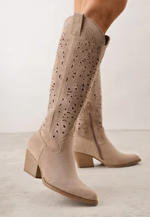 Ciemnobeżowe Ażurowe Kozaki Typu Kowbojki na Stożkowym Obcasie Antastus