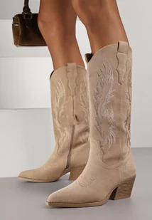 Ciemnobeżowe Kozaki Kowbojki na Stożkowym Obcasie z Haftowaną Cholewką Nallissea