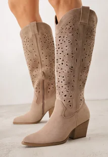Ciemnobeżowe Kozaki Kowbojki na Stożku z Ażurową Cholewką Uria