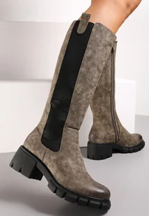 Ciemnobeżowe Kozaki na Grubej Podeszwie przed Kolano z Elastycznym Materiałem na Cholewce Kluzonia - Renee