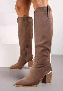 Ciemnobeżowe Kozaki Vices na Obcasie z Metaliczną Aplikacją Rianalla