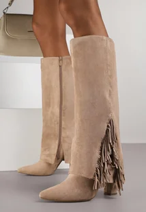 Ciemnobeżowe Kozaki na Słupku z Wywiniętą Cholewką z Frędzlami Linadela