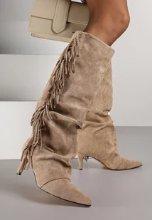 Ciemnobeżowe Marszczone Kozaki z Imitacji Zamszu na Niskiej Szpilce z Frędzlami Linonra