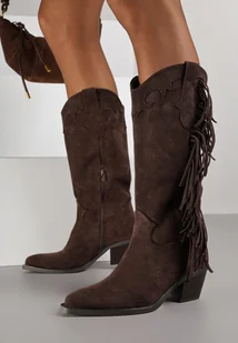Ciemnobrązowe Kozaki Kowbojki na Stożku Ozdobione Frędzlami Reianeva