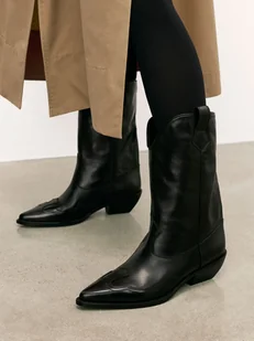 Czarne kowbojki wykonane z wysokiej jakości skóry naturalnej, zachwycają gładką fakturą i subtelnym połyskiem, który dodaje im eleganckiego charakteru. Wsuwana cholewka o charakterystycznie zaokrąglonym kształcie zapewnia wygodne dopasowanie, a praktyczne szlufki ułatwiają zakładanie, podkreślając westernowy styl modelu. Niski, szeroki obcas gwarantuje stabilność i komfort noszenia, sprawiając, że buty idealnie nadają się na co dzień. Dekoracyjne wycięcie na podbiciu dodaje im oryginalności i lekkości, subtelnie podkreślając linię nogi. Te kowbojki to doskonały wybór dla kobiet ceniących połączenie wygody, ponadczasowego designu i wyrazistego stylu inspirowanego amerykańską klasyką.