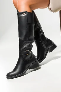 Czarne kozaki damskie na niskim klocku z ozdobą guma w cholewce Casu 68178-36