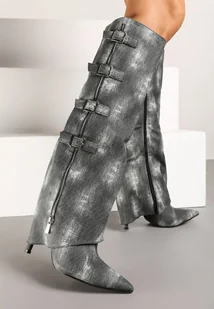 Pokochaj kozaki Riaviraen, które przełamują modowe schematy, łącząc denimową buntowniczość z elegancją szpilek. Klamry na wywiniętej cholewce to detal, który przykuwa uwagę i potęguje rockowy charakter. Ostro zakończony nosek buta dodaje kuszącej zuchwałości, a suwak ułatwia zakładanie. Idealne na jesienne eskapady w miejskim stylu, a także na wieczorne wyjścia, gdy zestawisz je z krótką, czarną sukienką i skórzaną ramoneską. Bądź odważna i czuj się niepokonana z każdym krokiem!