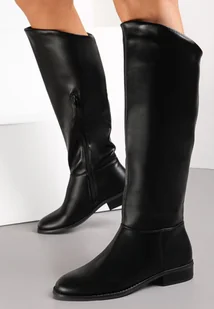 Kozaki Lazra z cholewką do kolana, lekko dłuższą z przodu, osadzone na niskim obcasie. Klasyczne damskie muszkieterki, zapinane na zamek błyskawiczny. Uwaga: wąska cholewka.