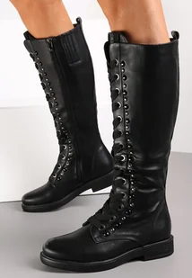 Kozaki Noko wykonane z imitacji skóry. W środku ocieplone kocem obuwniczym. Model o fasonie muszkieterek z wiązaniem z przodu. Ozdobne nity na całej długości cholewki, która sięga przed kolano. Zapinane na suwak wszyty od wewnętrznej strony.