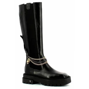 CZARNE SKÓRZANE KOZAKI DAMSKIE NA GRUBEJ PODESZWIE Z ŁAŃCUSZKIEM