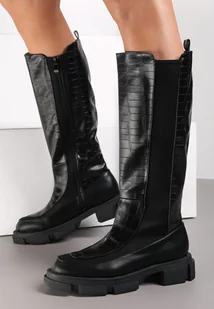 Kozaki Ombroce z modnym tłoczeniem imitującym skórę krokodyla. Osadzone na grubej podeszwie z ciekawymi żłobieniami. Wykonane z ekoskóry i materiału tekstylnego. Lekko ocieplane kocem obuwniczym. Sięgająca przed kolano cholewka posiada elastyczną wkładkę po zewnętrznej stronie, a po wewnętrznej zamek błyskawiczny.