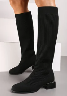 Czarne Kozaki na Słupku w Stylu Muszkieterek z Dopasowaną Cholewką i Metalicznym Elementem Leriha