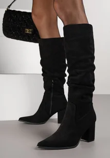 Czarne Kozaki na Słupku z Marszczoną Cholewką z Imitacji Zamszu Razialla