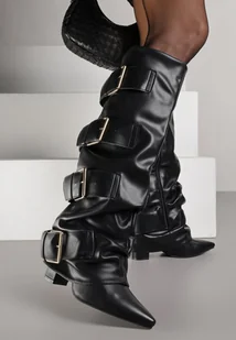 Czarne Kozaki na Słupku z Wywiniętą Cholewką i Klamrami Arullia