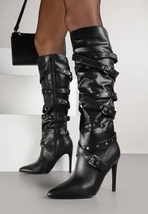 Czarne Kozaki na Szpilce Typu Bikery z Ozdobnymi Paskami i Klamrami Jeslife