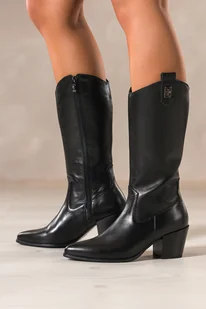 Czarne kozaki skórzane damskie kowbojki na szerokim ściętym klocku stalowa ozdoba PRODUKT POLSKI Casu 29844