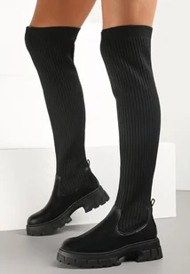 Kozaki Caeaera w stylu sztybletów z długą, skarpetkową cholewką za kolano. Górna część cholewki prążkowana, dopasowana do nogi, model wsuwany. Dolna część z licowej ekoskóry. Nieocieplone. Będą doskonale pasować do stylizacji z dzianinową sukienką mini i ramoneską lub skórzaną spódnicą.