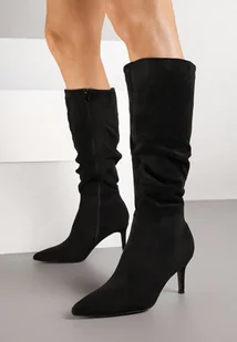 Czarne Kozaki z Imitacji Zamszu na Szpilce z Marszczoną Cholewką Rilareia