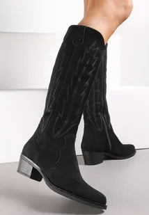 Czarne Kozaki z Ozdobnymi Przeszyciami na Płaskim Obcasie z Cholewką przed Kolano Amalwa - Renee