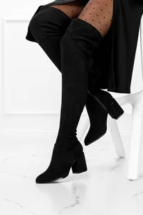 Czarne kozaki damskie za kolano na ozdobnym obcasie z elastyczną cholewką model D212X12-B zostały wykonane z wysokogatunkowego zamszu ekologicznego co gwaran...
