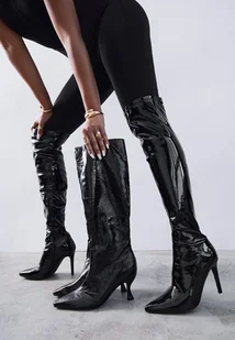 Czarne Lakierowane Kozaki Vices na Szpilce z Marszczoną Cholewką Calavelie