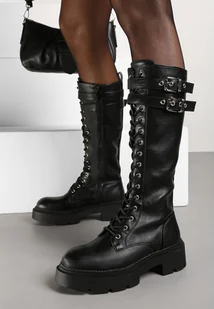 Czarne Sznurowane Kozaki na Platformie w Stylu Workerów z Paskami i Klamrami Asintoria