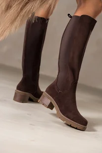 Czekoladowe kozaki damskie bieżnikowana podeszwa z ozdobnym przeszyciem elastyczna guma w cholewce Casu S7483-6