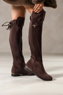 Czekoladowe kozaki damskie płaski obcas ze złotą wstawką elastyczna cholewka z wiązaniem i chwostami złota ozdoba Casu NW2409-7