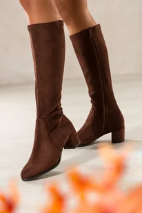 Czekoladowe kozaki damskie Sergio Leone na niskim obcasie z elastyczną cholewką PA794