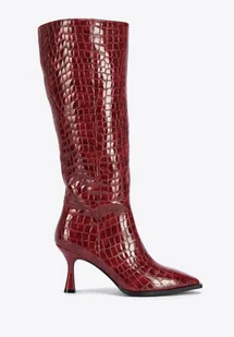 Damskie kozaki z lakierowanej skóry croco na szpilce bordowe 35