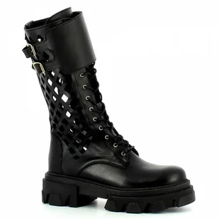 Kozaki na grubej podeszwie to hit tego sezonu! Buty te wykonane są z wysokogatunkowej, naturalnej skóry. Model ten zaprojektowaliśmy specjalnie dla kobiet, które uwielbiają niebanalne kompozycje. Na skórzanej, matrycowanej cholewce umieściliśmy ozdobny pasek, który pełni funkcję dekoracyjną, nadając niebanalnego wyglądu. Poprzez sznurówki możesz idealnie dopasować buty do szerokości każdej łydki, a od wewnętrznej strony znajduje się suwak, który ułatwia ich zakładanie. Te kozaki pasują zarówno do eleganckich i codziennych outfitów - sprawią, że nie będziesz