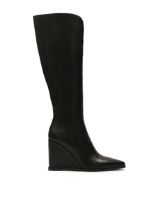 <p>Skórzane <strong>kozaki</strong> osadzone na koturnie to wygodna i niezwykle stylowa propozycja na ten sezon. Wysoka cholewka wyposażona w suwak posiada ładnie zaokrąglony górny brzeg oraz subtelne wycięcie. Uwagę przykuwa pionowe przeszycie na przodzie, które w połączeniu ze spiczastym noskiem optycznie wydłuża i wysmukla nogę. Niebanalne kozaki w łatwy sposób odmienią klasyczne, monotonne stylizacje. </p> <ul> <li>Wyściółka z semianilinowej skóry owczej,