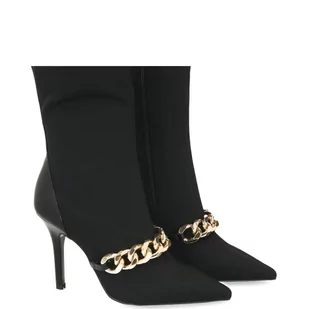 Czarne kozaki na wysokiej szpilce z ozdobnym łańcuszkiem