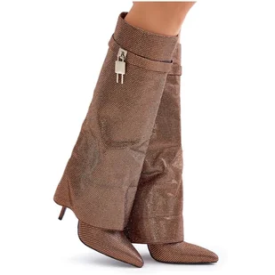 Zdobione Wsuwane Kozaki Na Szpilce Z Wywiniętą Cholewką Brązowe Enathlin. Sprawdź na butymodne. pl! Kozaki damski