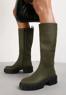 Kozaki Pyrhea zapinane na zamek błyskawiczny. Cholewka kończąca się przed kolanem. Nosek klasyczny, o zaokrąglonej krawędzi. Osadzone na grubej podeszwie z obcasem, żłobieniami i protektorem. Wykonane z ekoskóry, lekko ocieplane.