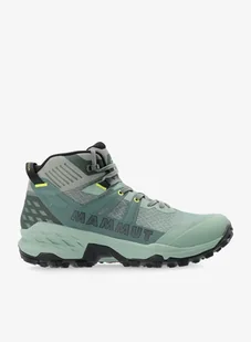 Buty turystyczne damskie Mammut Sertig II Mid GTX - jade/dark jade - posiadają cholewkę wykonaną z trwałej i przewiewnej siatki. Wierzch buta zapewnia dobre dopasowanie do stopy, a naszyte wzmocnienie przy palcach zabezpiecza je przed urazami. Model wyposażono w laminat GORE-TEX®, który zapewnia wysoki wskaźnik wodoodporności i jednocześnie zabezpiecza stopy przed przegrzaniem. Standardowe sznurowanie pozwala na uzyskanie indywidualnego dopasowania do stopy. Za efektywne tłumienie wstrząsów podczas wędrówki odpowiada podeszwa środkowa z pianki EVA.